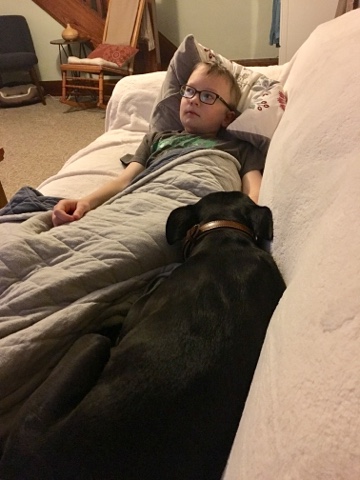 Flip is very happy that Wm is on spring break! He slept with Wm last night for most of the night (until Luna took his place!) And he also kept a sick Willie company on the couch as his snuggle friend: